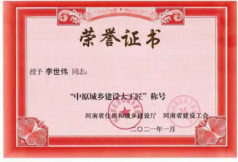 哈尔滨维思资源开发有限公司李世伟同志获“中原城乡建设大工匠”称号